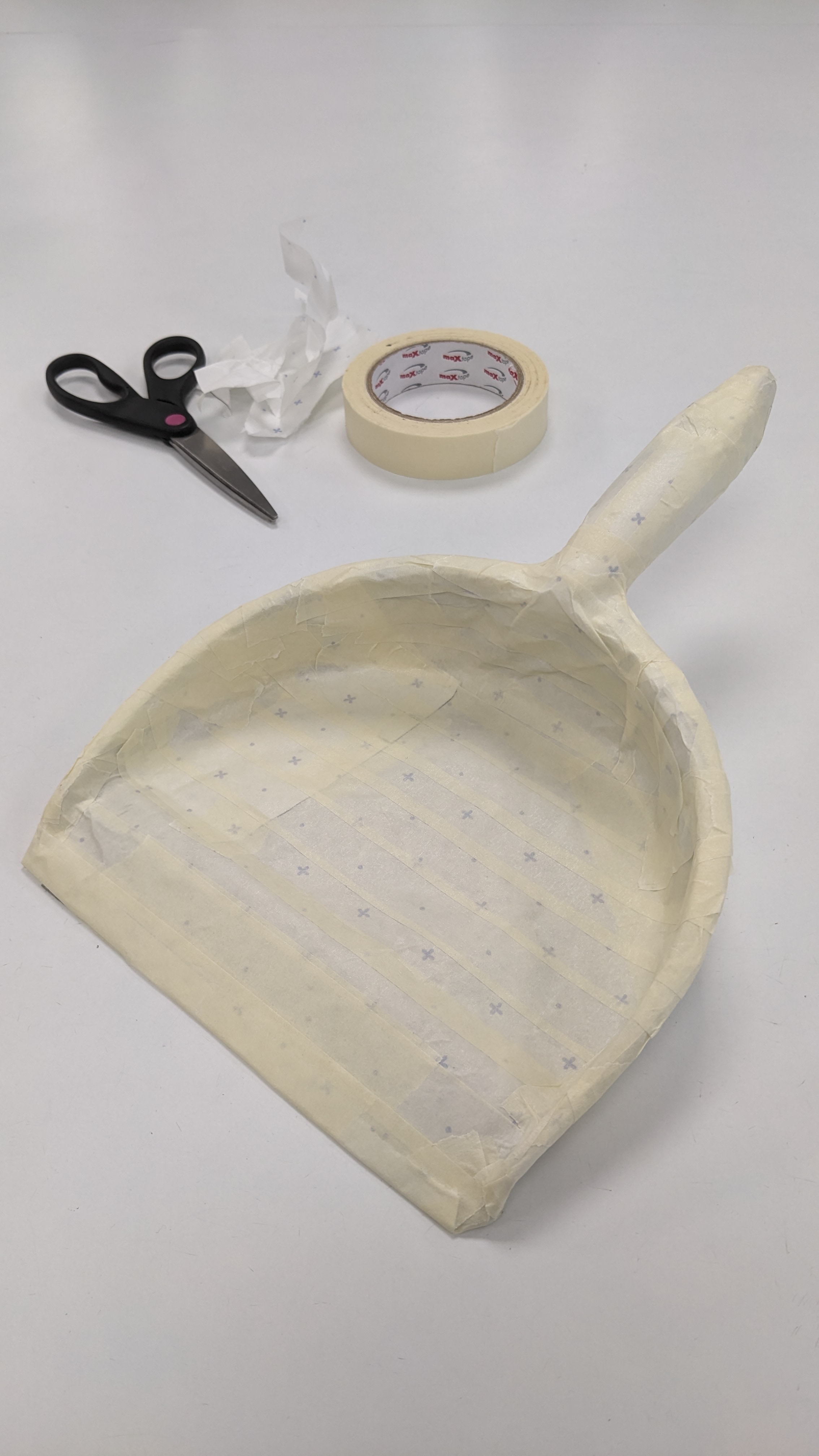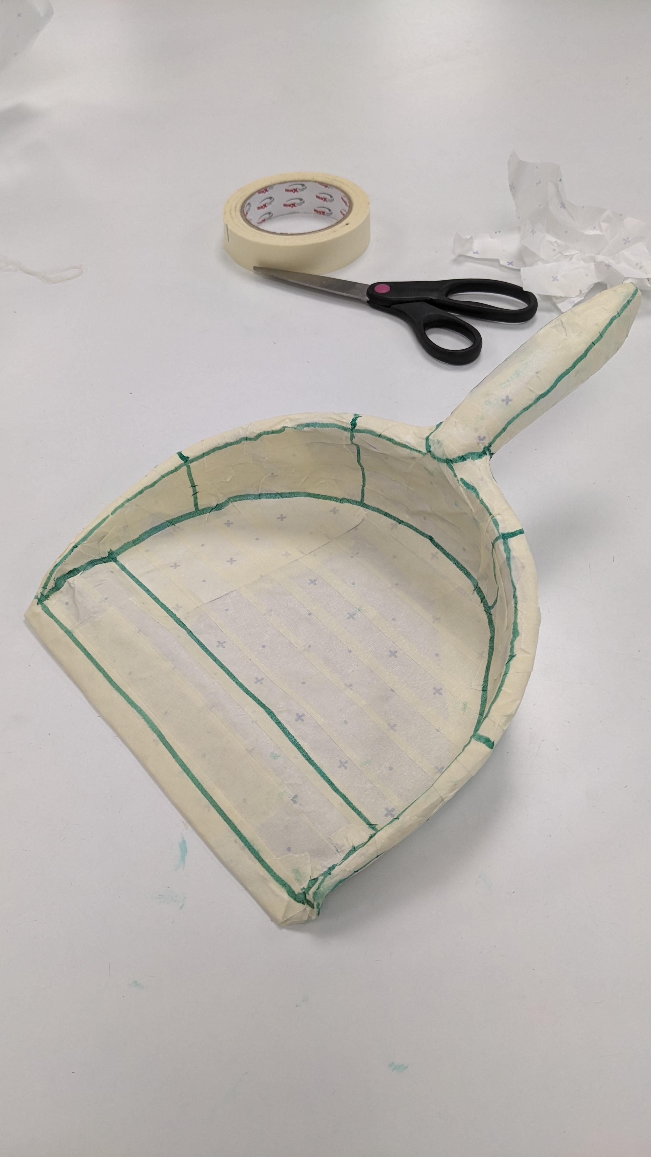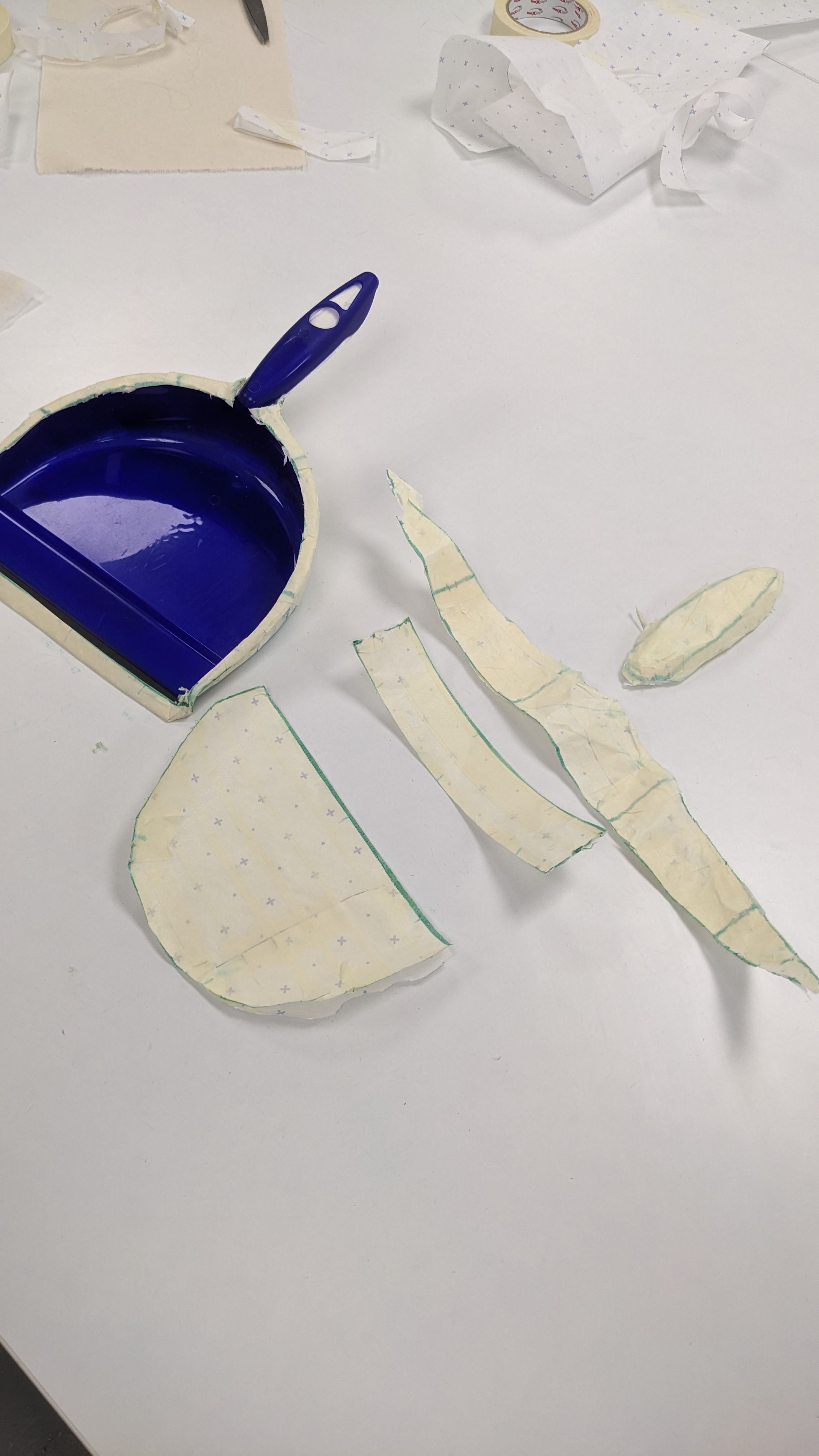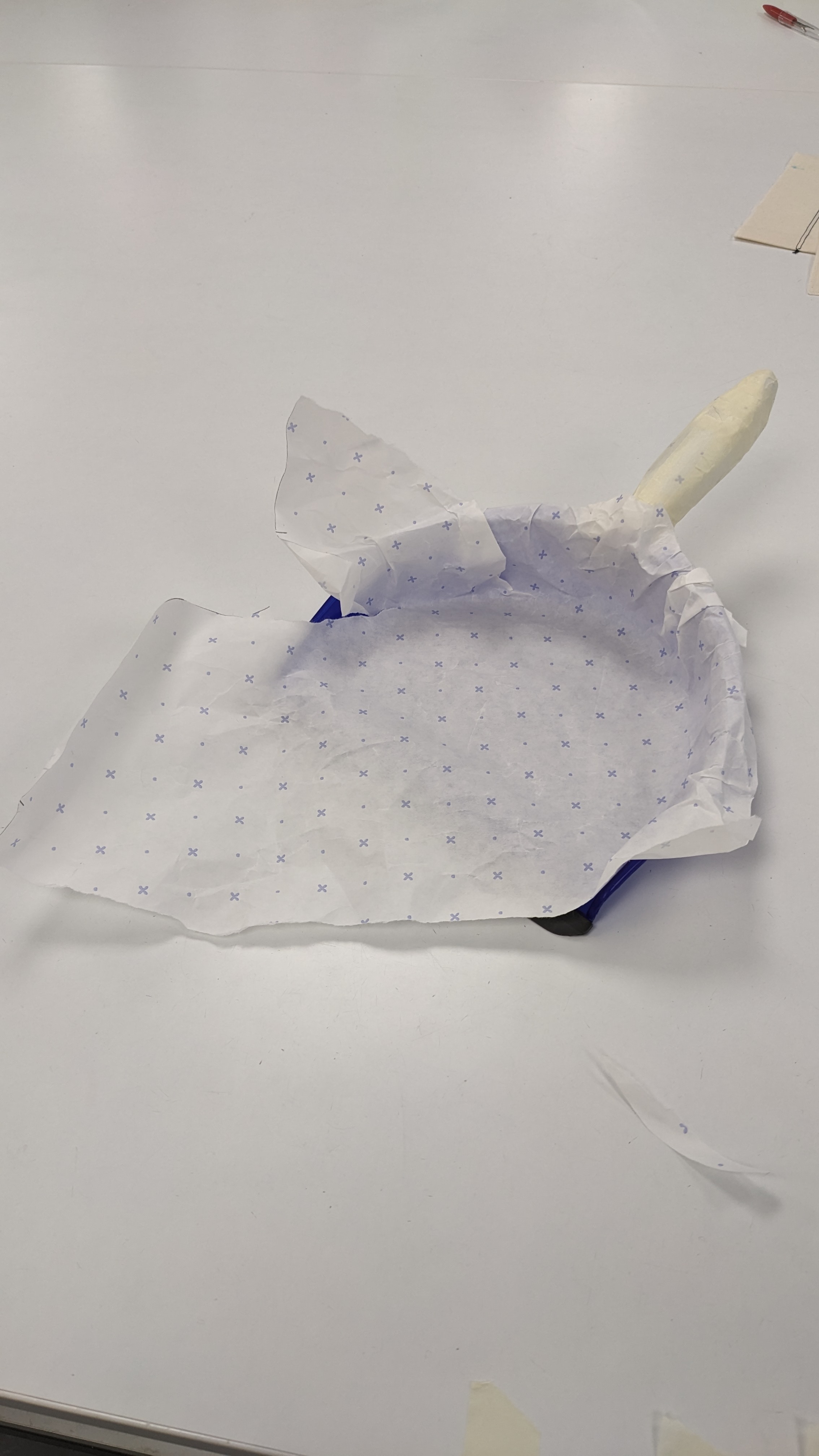 But the highlight of the session was learning the pattern cutting process, taking 3D objects and making them 2D forms out of paper. I opted to deconstruct a dustpan – based on the topics I have been researching, I liked the idea of taking a domestic household item and subverting its function by creating a new form from its shape.
