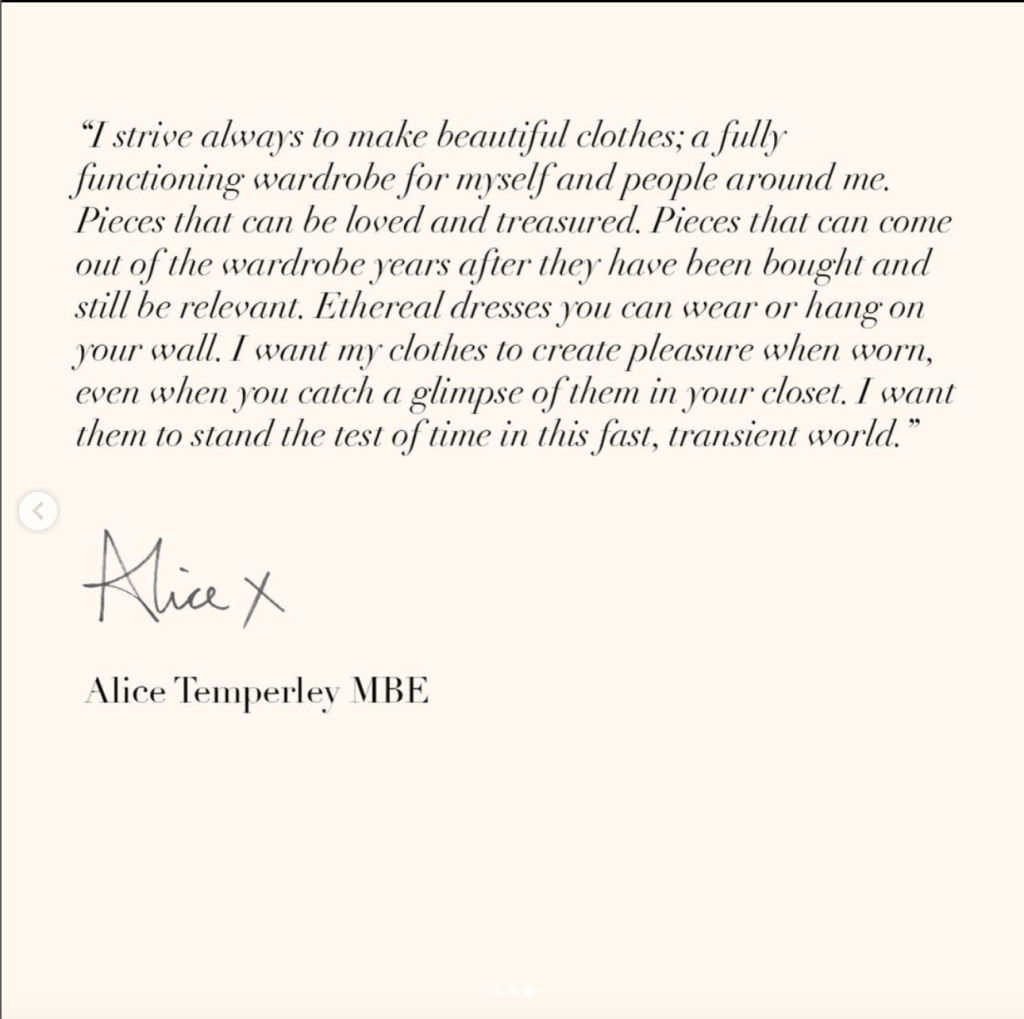 Temperley London [@temperleylondon]. (2023, June 8). A message from Alice Temperley. Instagram. https://www.instagram.com/p/CtOXl1_M0aK/?img_index=1