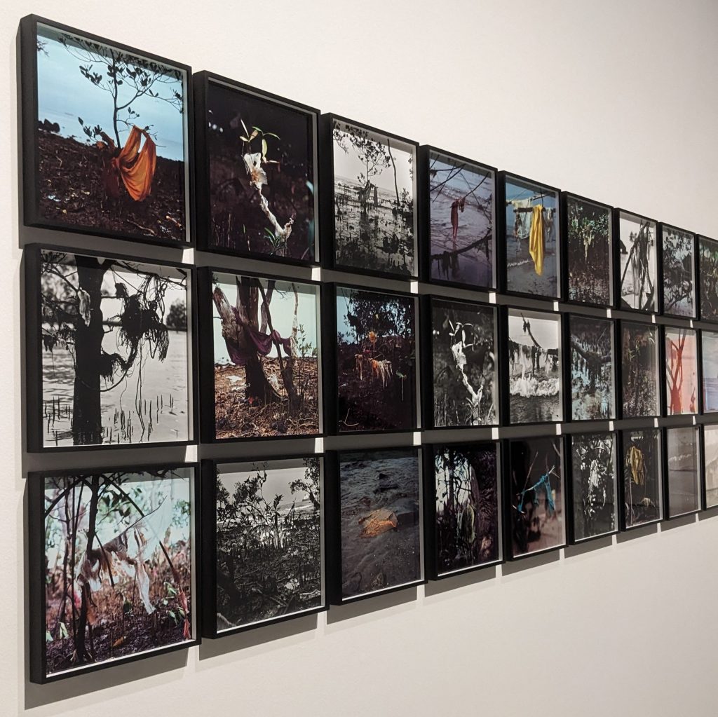 Simryn Gill’s Channel (2014) is a series of photographs of treelines and beaches strewn with plastics and fabrics that have been washed up on shore. Not only are they visually beautiful but they show how nature and manmade items are now interwined, the materials and the trees look like they exist as one rather than polluting and spoiling the environment. The series intends to highlight how extensive production, industry, trade and waste is globally which has a relatedness to ‘the story of stuff’ and that linear system.