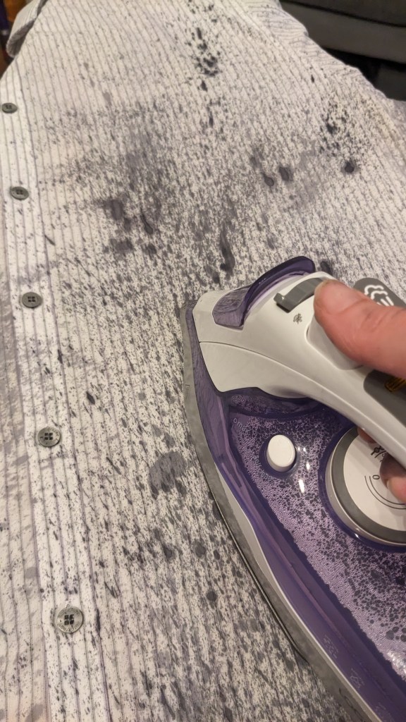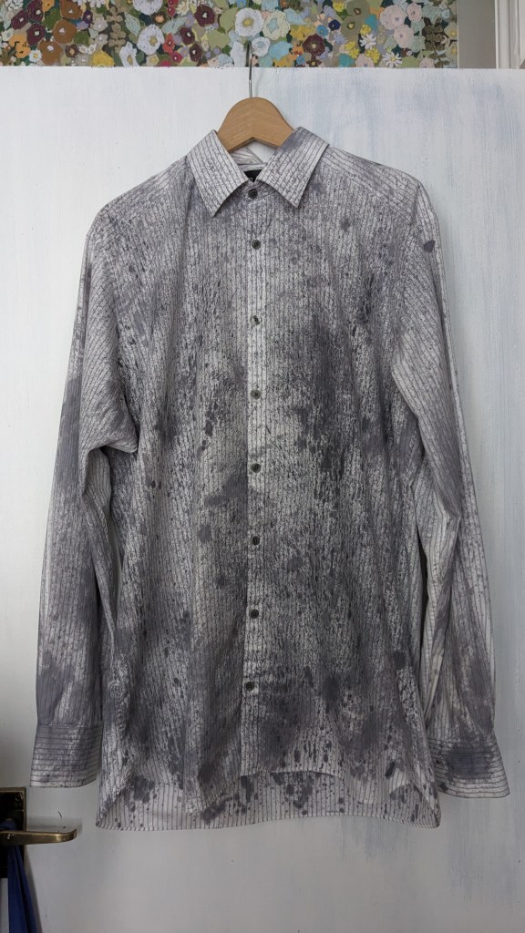 I was very generously given a jar of the ink to take home with me. I mulled it over how I could apply this within my project and decided to experiment with putting the dye in the water compartment of my iron and using the steam function with one of the shirts I had from the charity shop. I like the outcome, it has a sense of anger about it. Like a 1950’s housewife destroying her husbands shirt in resentment.